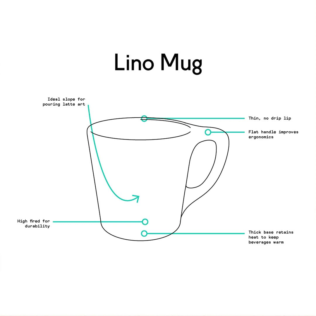 - Versiones disponibles en la serie Lino: Taza de espresso 9 cl, taza de cappuccino 18 cl, tazas de latte 24 cl y 36 cl, taza de café 30 cl, platos pulled, jarra para leche y tazas coloridas