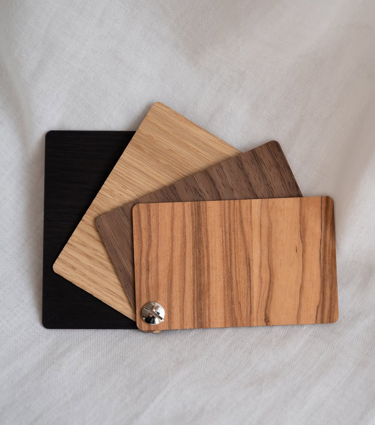 Las muestras son delgadas, tratadas con el mismo aceite natural que utilizamos en nuestros productos terminados y unidas con un práctico tornillo de metal.