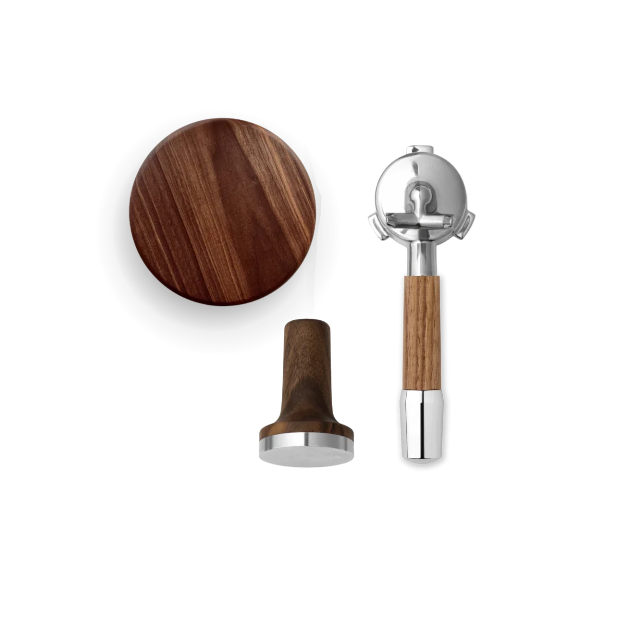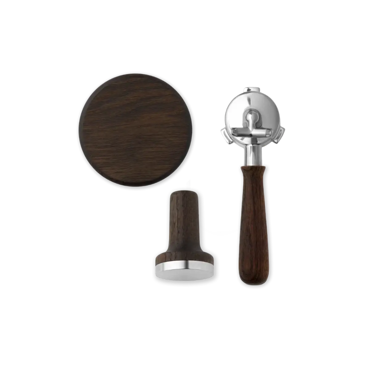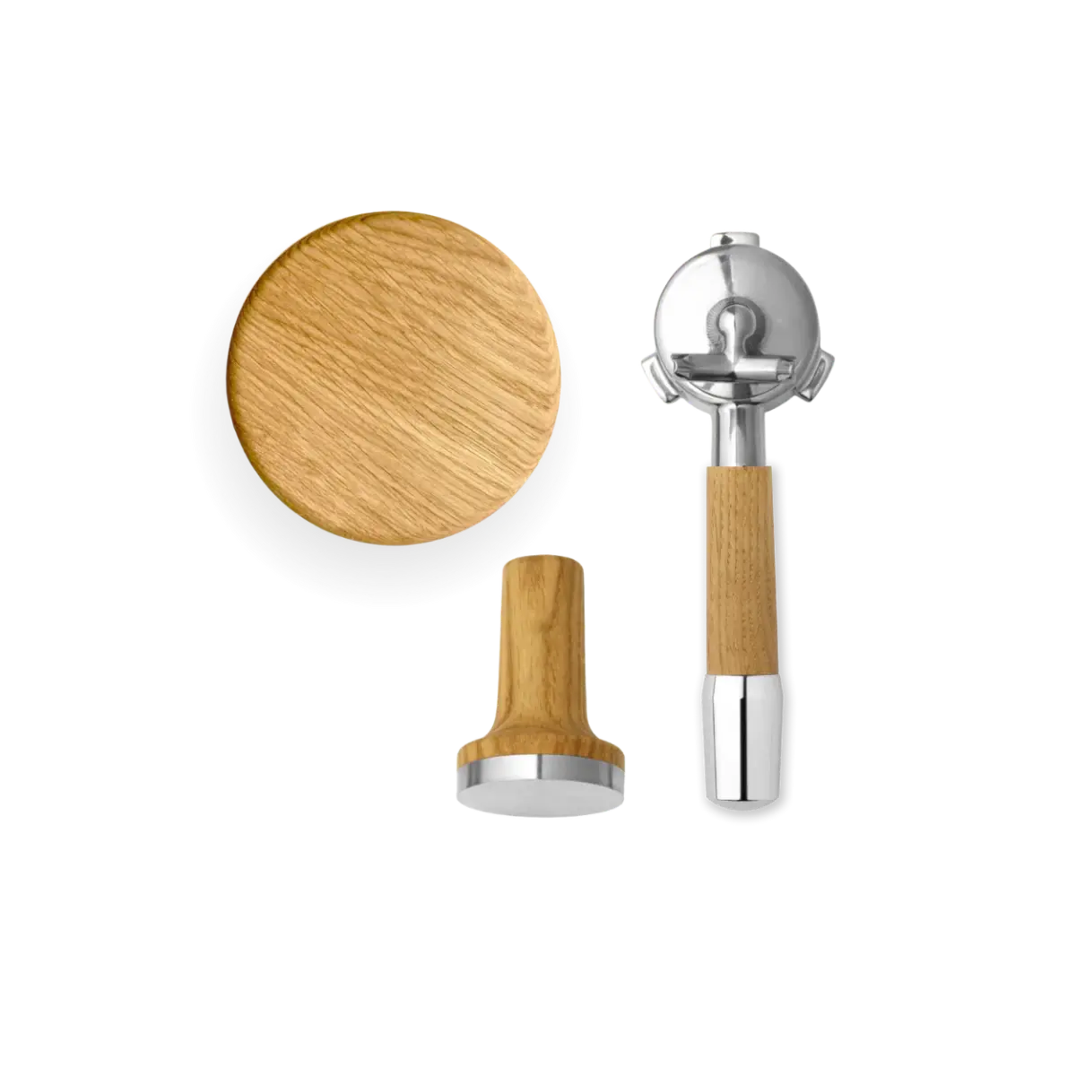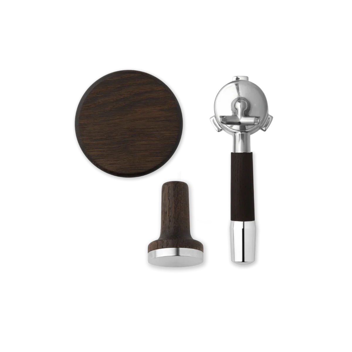 El paquete incluye un prensador de café magnético con ajuste de 53,5 mm, una tapa para el portabolsas con mango ergonómico de madera y un portafiltro con estilo de mango seleccionable en diseño moderno o clásico. Juntos, las piezas crean una sensación uniforme y más sofisticada alrededor de tu preparación diaria de espresso.