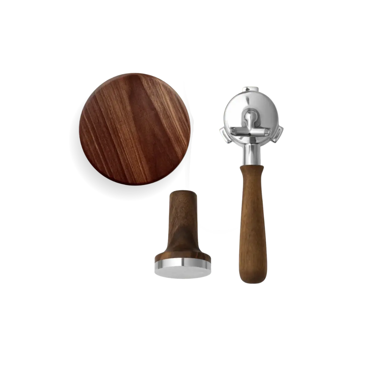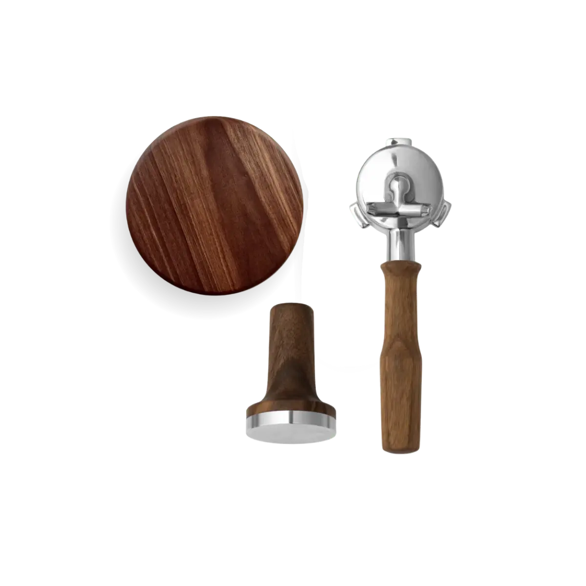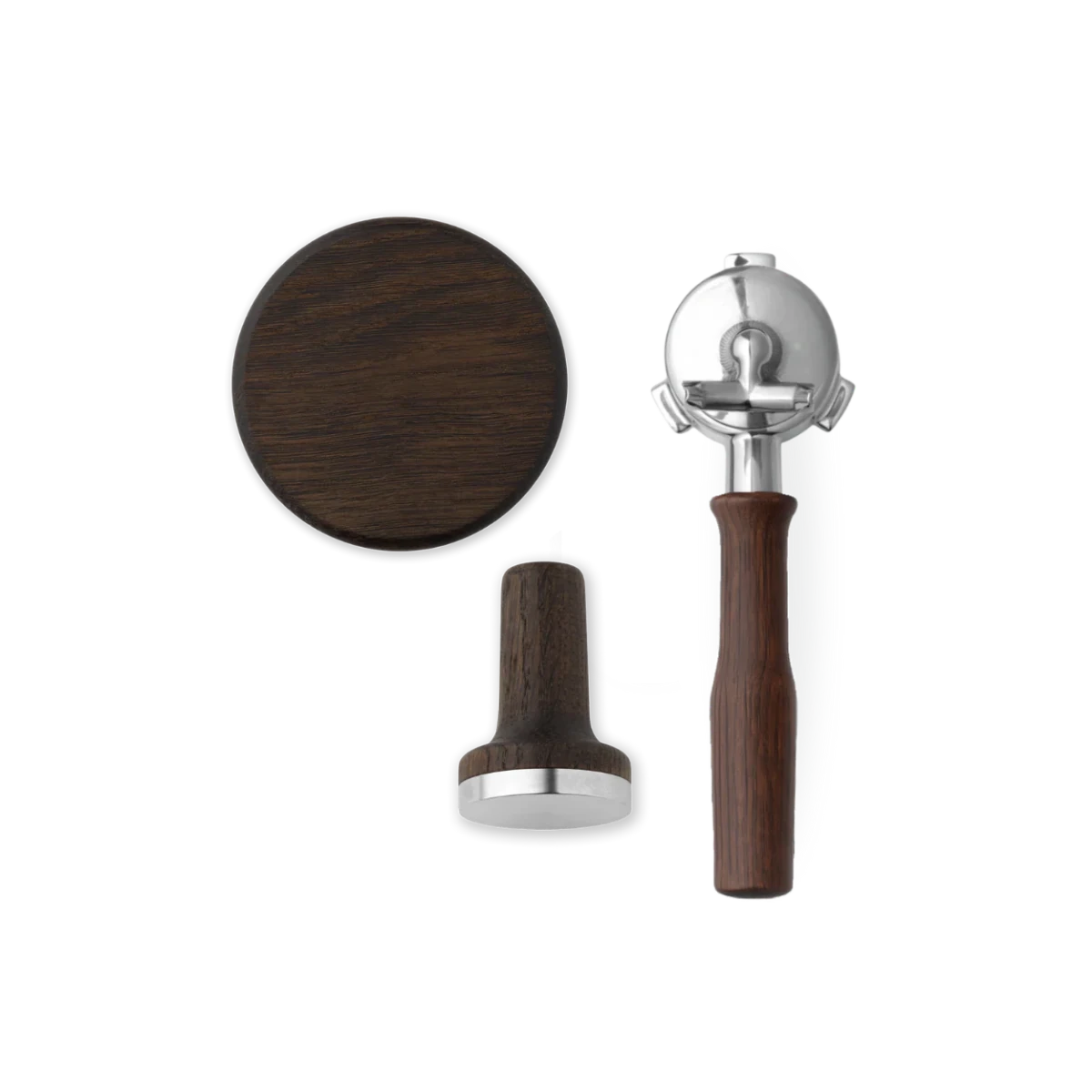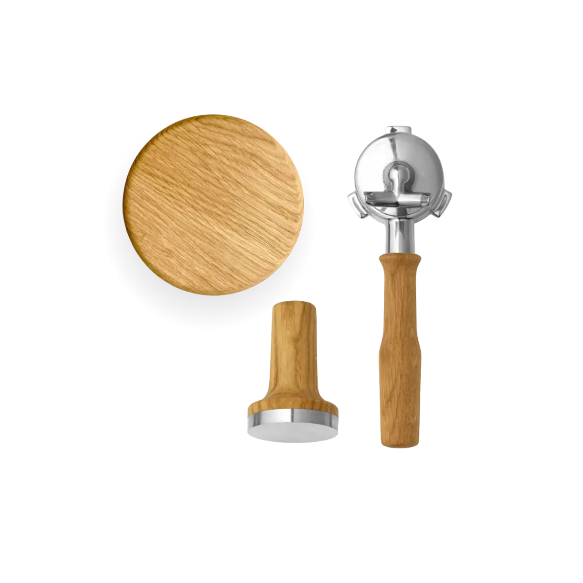El paquete incluye un prensador de café magnético con ajuste de 53,5 mm, una tapa para el portabolsas con mango ergonómico de madera y un portafiltro con estilo de mango seleccionable en diseño moderno o clásico. Juntos, las piezas crean una sensación uniforme y más sofisticada alrededor de tu preparación diaria de espresso.