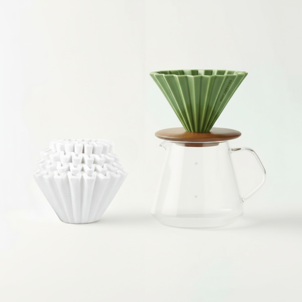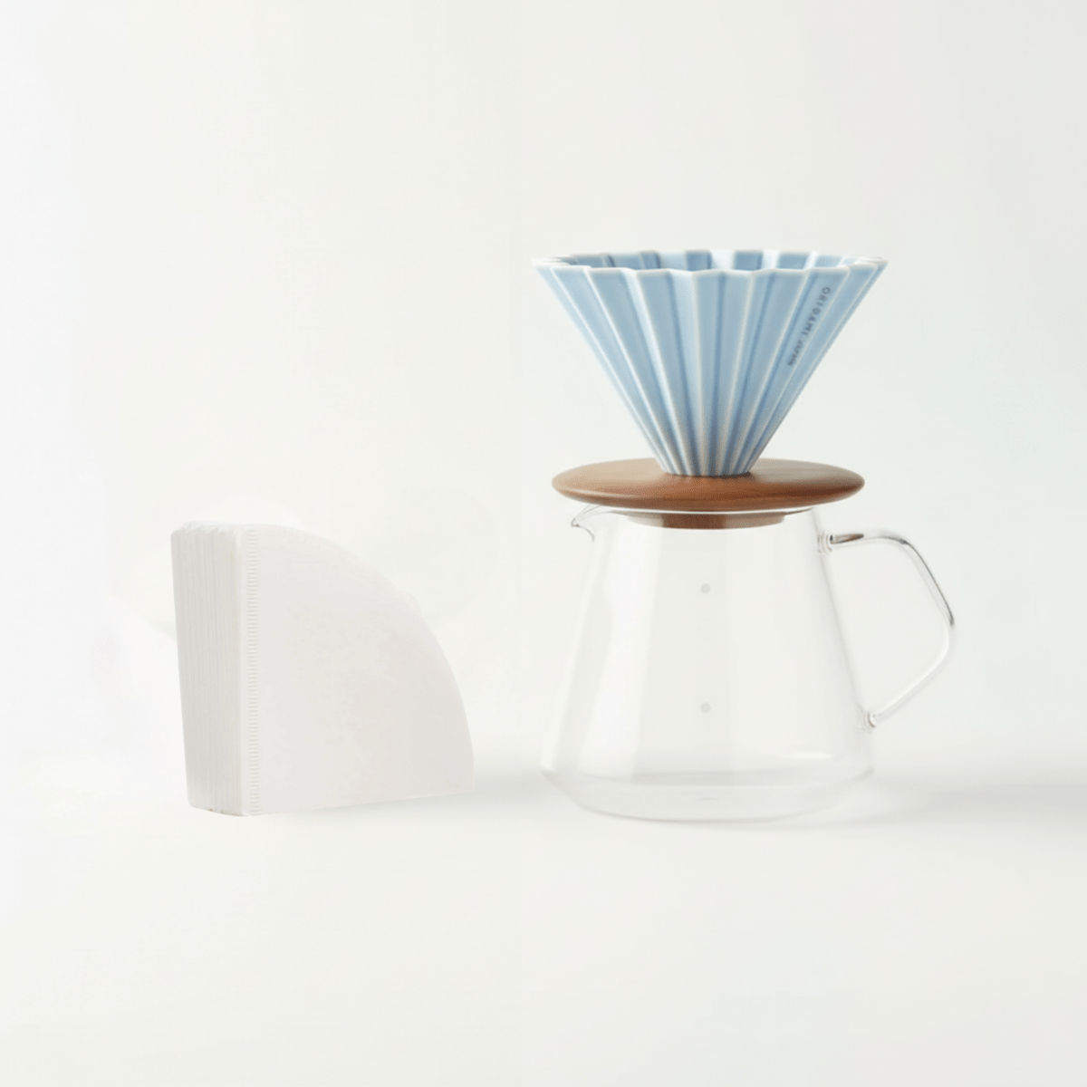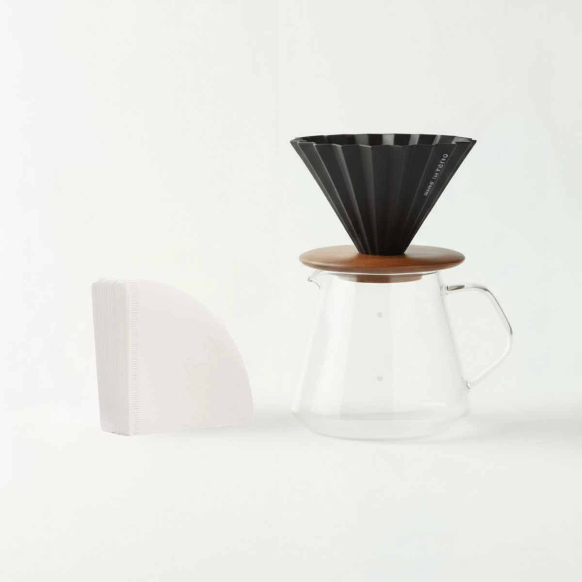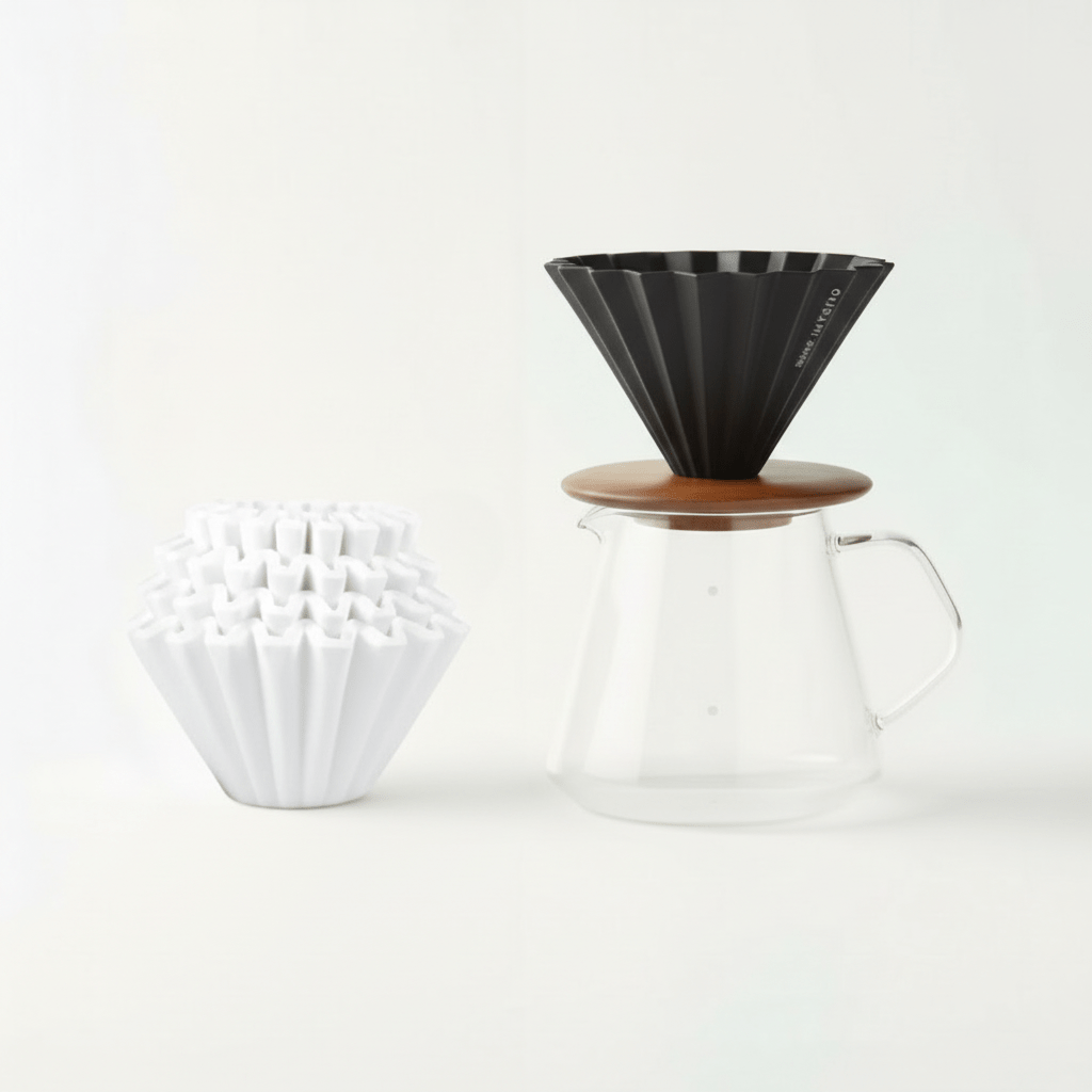 Descubre el arte japonés del pour over con este set completo de Origami. Todo lo que necesitas para preparar café excepcional con precisión y elegancia, desde el dripper hasta la jarra y los filtros.