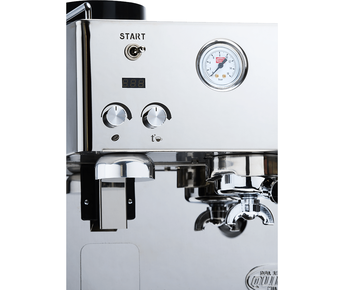 Controles: PID; manómetro de presión de bomba 0–16 bar; pantalla (temp, temporizador de shot); válvula de perfilado; modo de espera programable; interruptores de palanca; luces indicadoras; tamper integrado; botón de control de temperatura