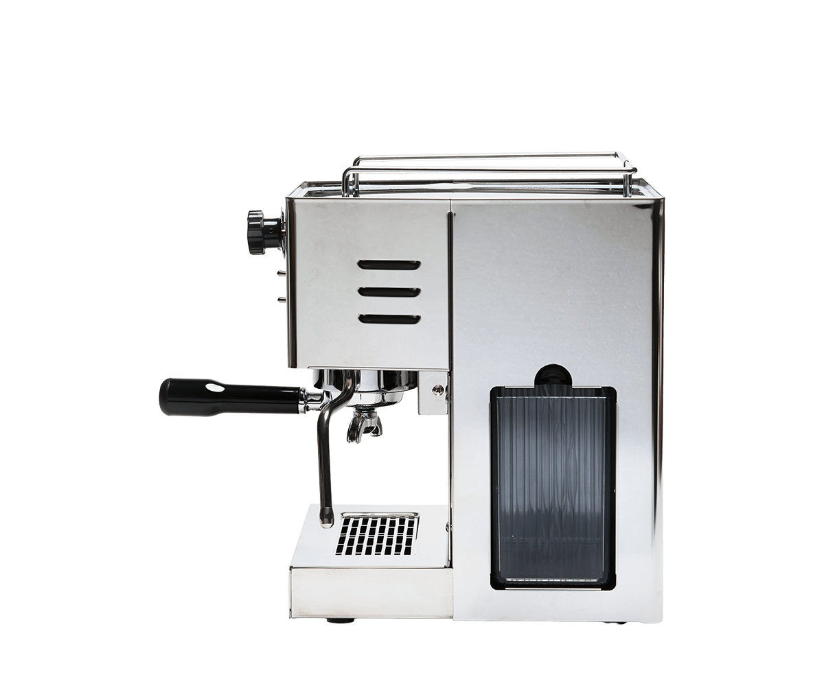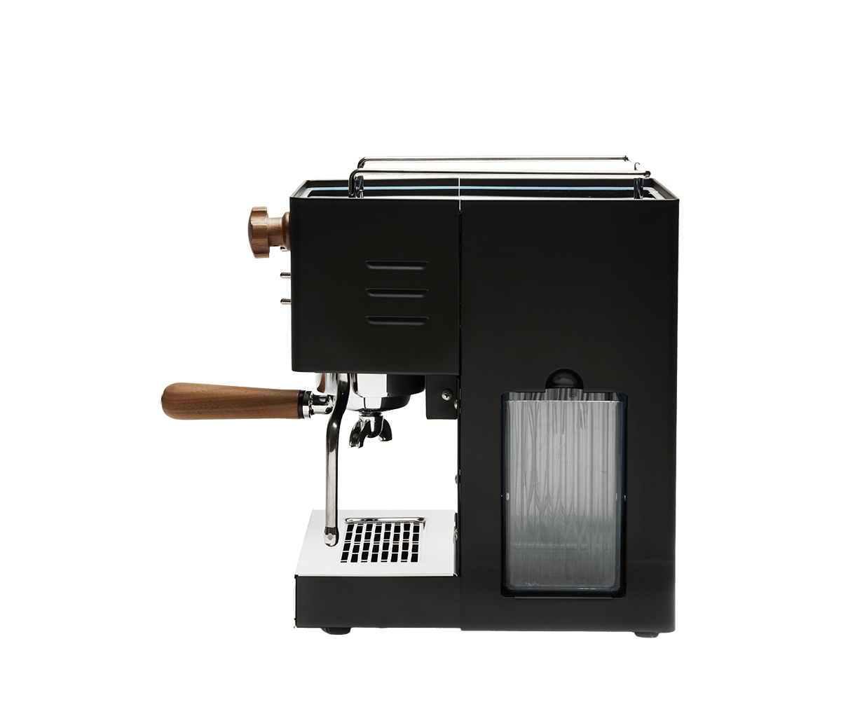 El chasis y los componentes exteriores están fabricados en acero inoxidable. La máquina también está disponible en versión negro mate con perilla de vapor y portafiltro de madera—perfecta para quienes gustan del diseño moderno.