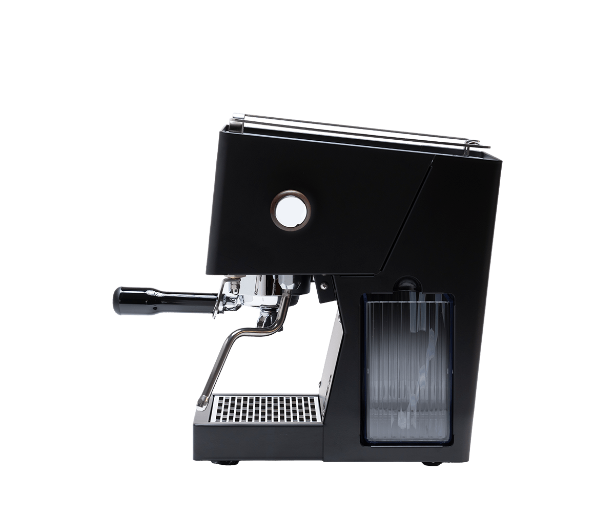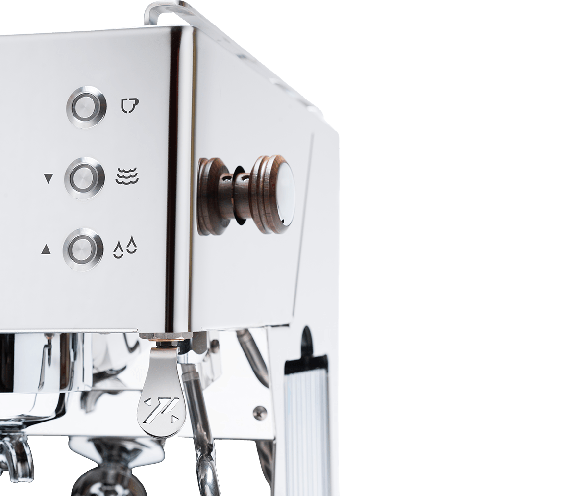 La máquina está disponible en acero inoxidable o negro mate, ambos con detalles de madera en la perilla de vapor y el portafiltro. El grupo de infusión anular proporciona calor constante y calidad de construcción confiable.