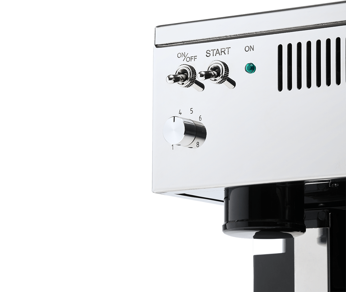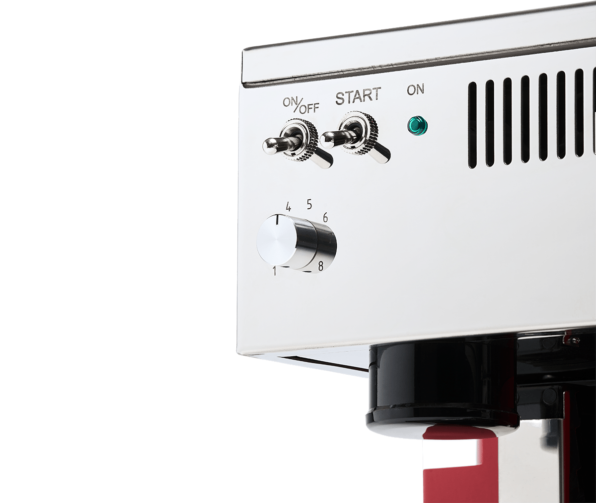 La máquina se controla mediante palancas clásicas, luces indicadoras y un tamper incorporado — una experiencia completa y sencilla de “del grano a la taza”.