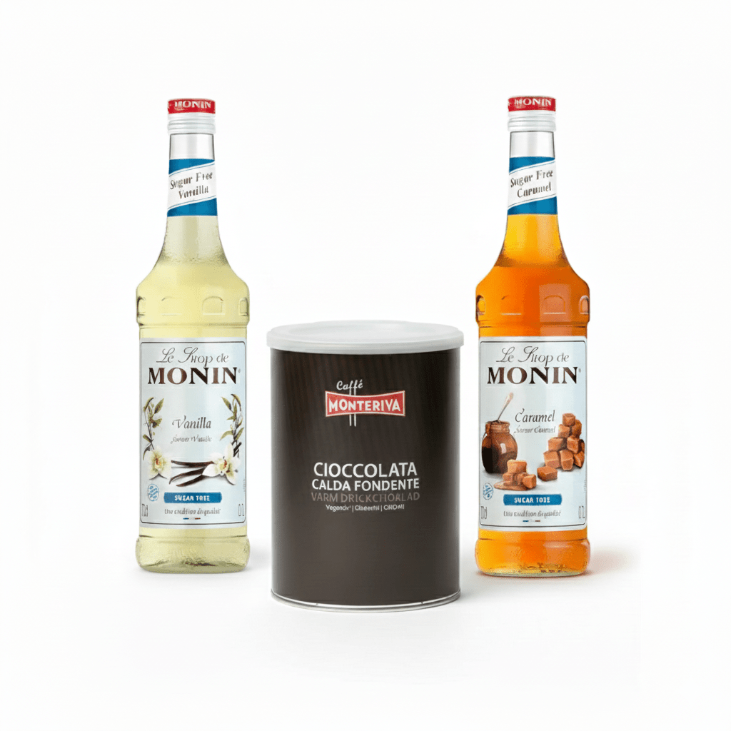 El Trío Dulce de Santa combina todo lo que necesitas para crear bebidas calientes de lujo en casa. Este paquete incluye tres productos premium que juntos te ofrecen infinitas posibilidades para disfrutar de chocolate caliente italiano, café saborizado y creativas variantes de moka.